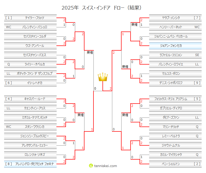 ジョアン・フォンセカ(19歳・ブラジル)が第8シードのアレハンドロ・ダビドビッチ フォキナ(26歳・スペイン)をセットカウント2-0(6-3、6-4)で破り、スイス・インドア初優勝を飾りました。
