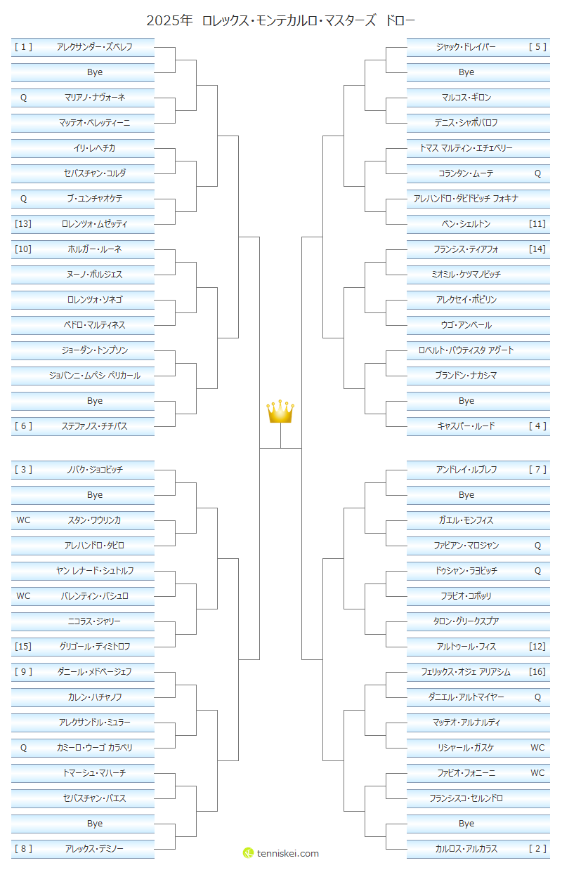 モンテカルロ・マスターズの1回戦から決勝までの結果は、『 2025年ロレックス・モンテカルロ・マスターズの結果(マスターズ1000)』の記事をご覧ください。