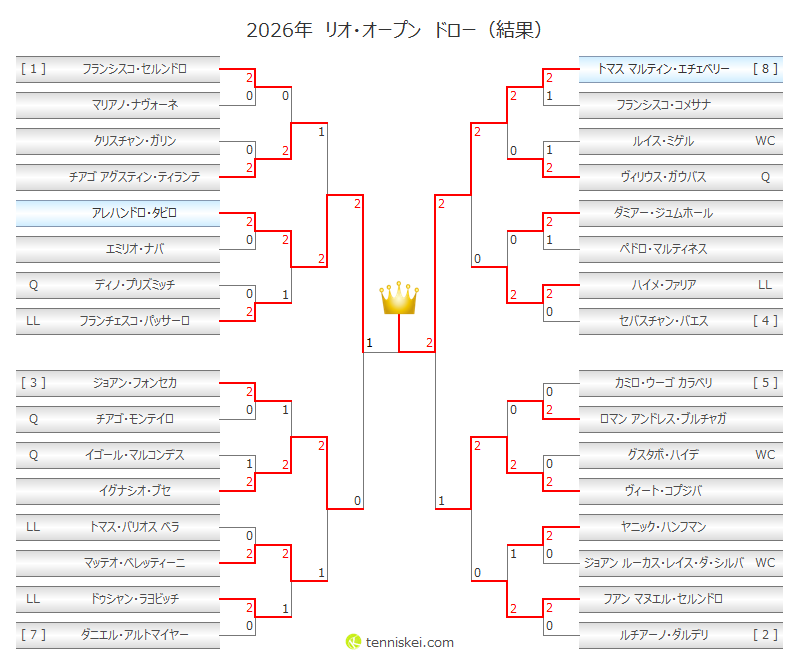 2026年2月16日から2月22日(2026年第7週)にリオデジャネイロ(ブラジル)で開催されるATP500「リオ・オープン」の1回戦から決勝までの結果、出場選手、賞金を紹介します。