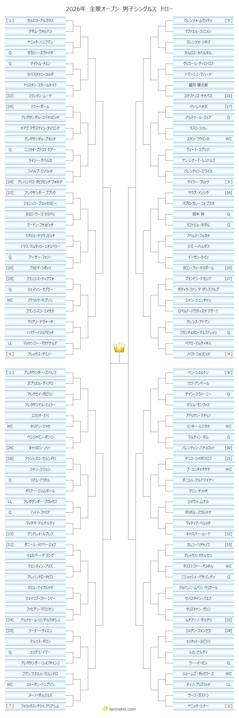 アルカラスは世界1位としてシーズン入りし、全豪制覇でキャリアグランドスラム達成を狙う存在と位置付けられている。 攻撃的なオールラウンドプレーと2025年の全仏・全米制覇が高く評価される一方、新コーチ体制への適応が大会序盤の不確定要素とみなされている。 - ヤニック・シナー